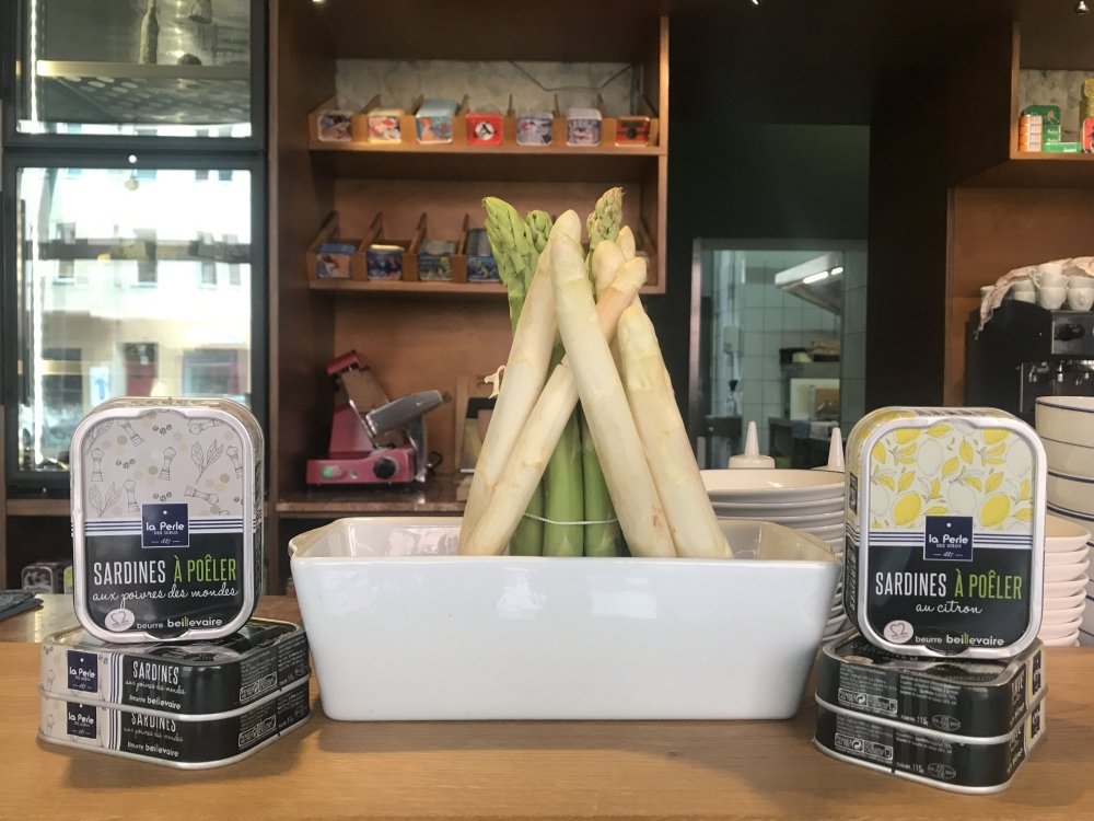 Es ist Spargelzeit und alle freuen sich! Wir sind da keine Ausnahme und machen uns sogar schon immer lange im Voraus Gedanken, welchen Wein wir als unseren diesjährigen Spargelwein empfehlen sollen. Dieses Jahr ist es der Minho Verde Camaleaõ. Nach der Weinfrage ist die Frage der adäquaten Begleitung zu erörtern: bei uns gibt es diesmal Spargel mit Butter-Sardinen von La Perle des Dieux und eine schnelle Sauce Hollandaise. Das Rezept stammt von Thomas Vetter von der Sardinen.Bar. Ihn habe ich in seinem Laden in Berlin Schöneberg besucht und das Rezept mit ihm zusammen gekocht.