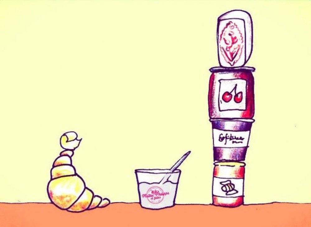 We start with a typical "petit déjeuner à la française." In cooperation with our neighbors from the wonderful Pâtisserie Zuka, we'll also serve brioche from master pastry chef Gil Avnon, French raw milk butter from Poitou-Charentes, fruity jams, and fromage blanc from Bresse imported especially for the occasion.