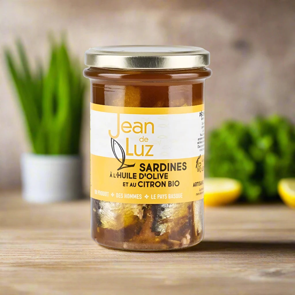 These sardines are slightly larger than usual and less fatty. This is due to their special preparation: First, these sardines are fished in the Bay of Biscay during the winter using traditional (and sustainable) methods. They are then scaled, beheaded, gutted, and brined overnight. Afterward, they are air-dried for 5 to 6 days and preserved in jars without being fried or cooked beforehand.