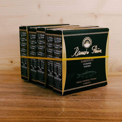 Frisch gefangene kleine Sardinen aus den Buchten Galiziens in einer leckere Gemüsesauce und Olivenöl. Morgens am Hafen eingekauft und sofort verarbeitet. In der Fabrik werden die Sardinen ausgenommen, gewaschen, getrocknet und in Weizenmehl gewendet und dann frittiert. Nach dem Abkühlen werden sie eingedost mit eine hausgemachte frische Gemüsesauce.