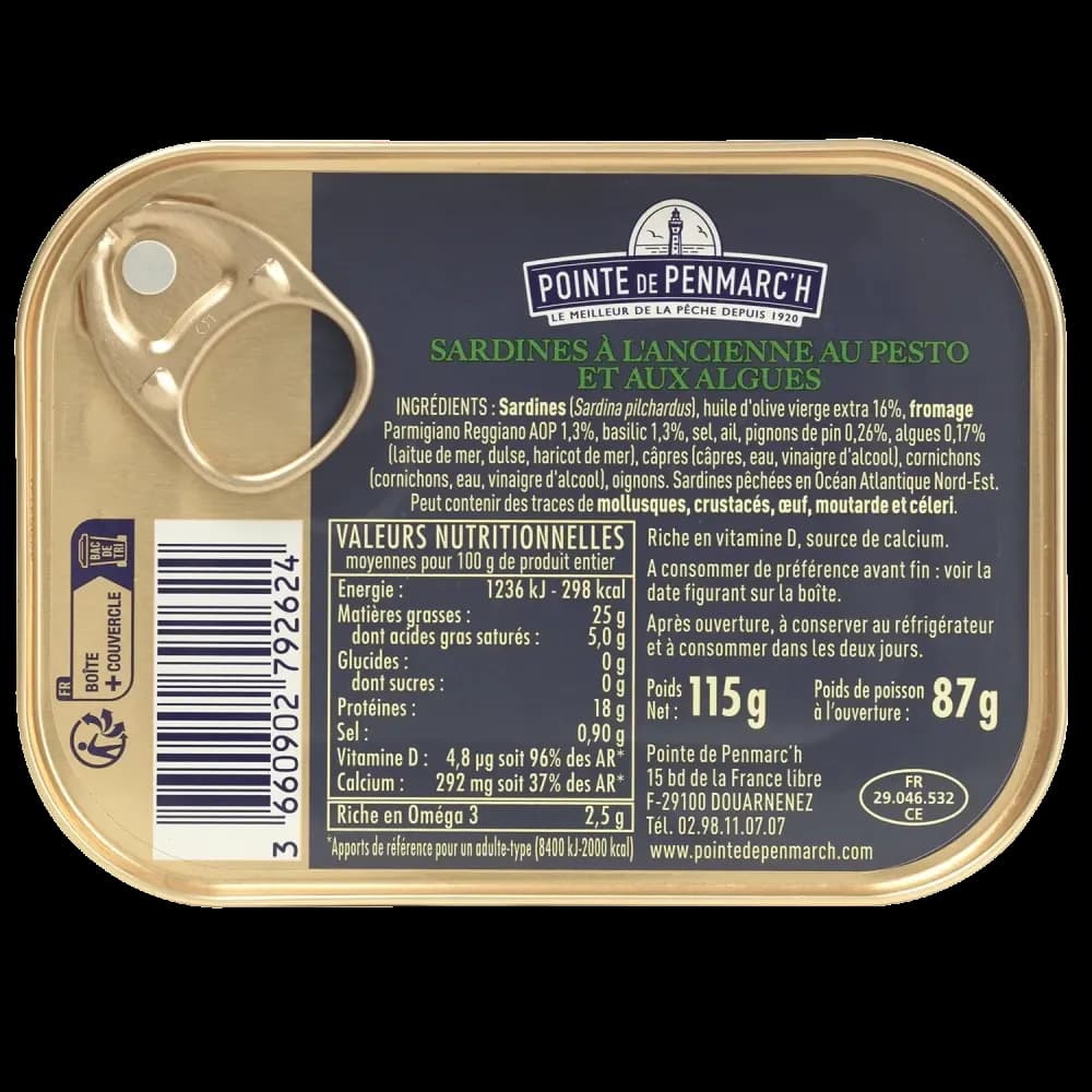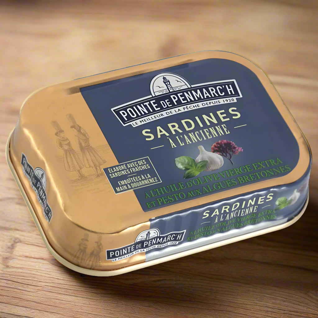 Diese exquisiten Sardinen mit Pesto und Bretagne-Algen vereinen die sonnigen Aromen von Basilikum, Olivenöl und Parmesan mit den jodhaltigen Noten gekochter bretonischer Algen zu einem ganz besonderen Geschmackserlebnis.