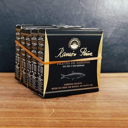 Diese frisch gefangene größere Sardinen aus den Buchten Galiziens werden sofort frittiert und dann in mühevolle Handarbeit sauber verarbeitet zu wunderschönen Sardinenfilets ohne Haut und ohne Gräten. Normalerweise sind wir nicht begeistert von Sardinenfilets weil sie zu trocken sind, aber hier machen wir gerne eine Ausnahme; sie sind perfekt.