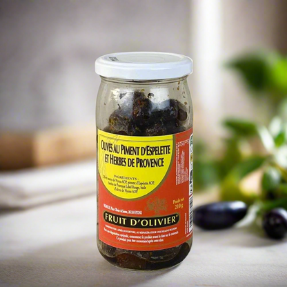 Sie werden mit ihrem Stein, Piment d'Espelette und Kräuter der Provence eingelegt. Der herrlich würzige Eigengeschmack der Oliven wird durch die Mischung mit Chili wunderbar ergänzt und unterstrichen.