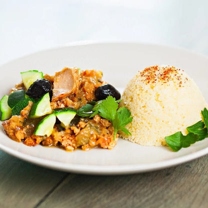 Dieses kreative Gericht ist eine Tajine aus weißem Thunfisch, welche mit Zucchini, Obst und Gewürzen langsam zubereitet wird.