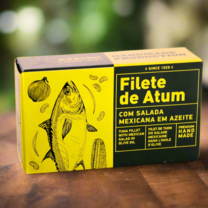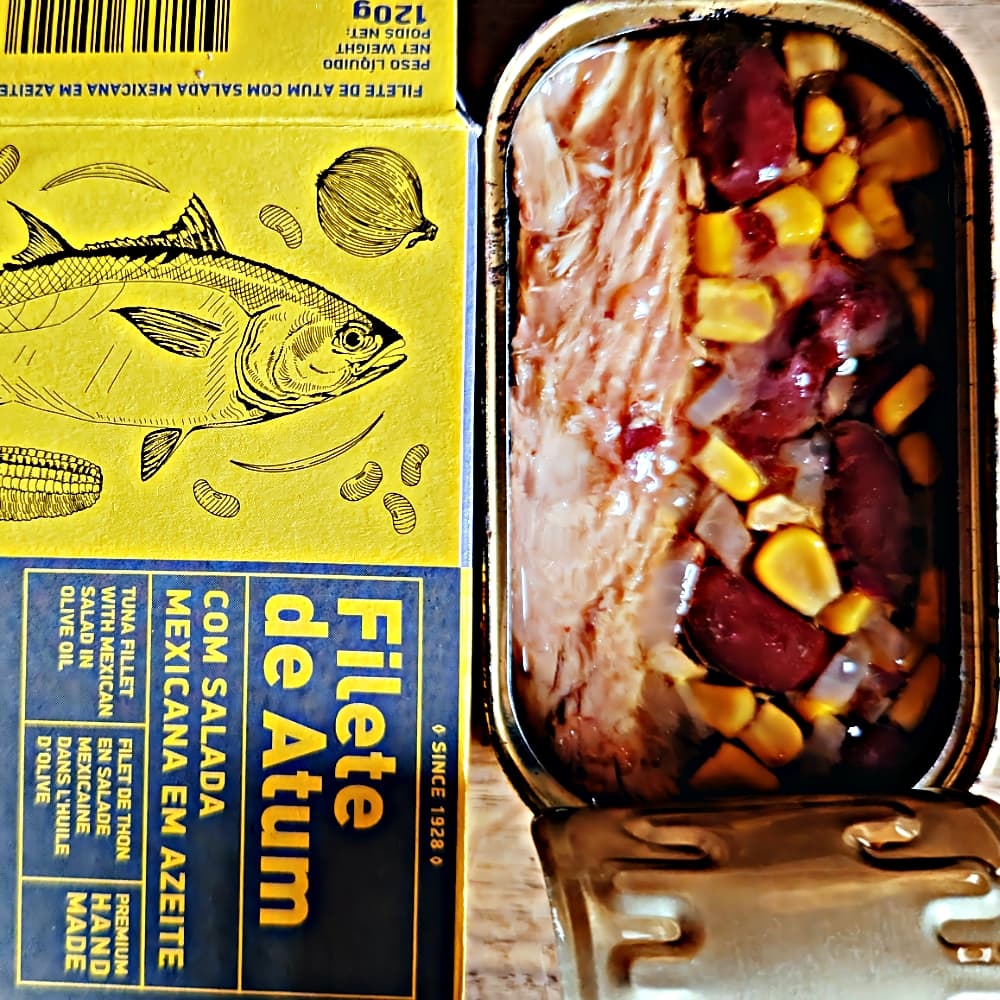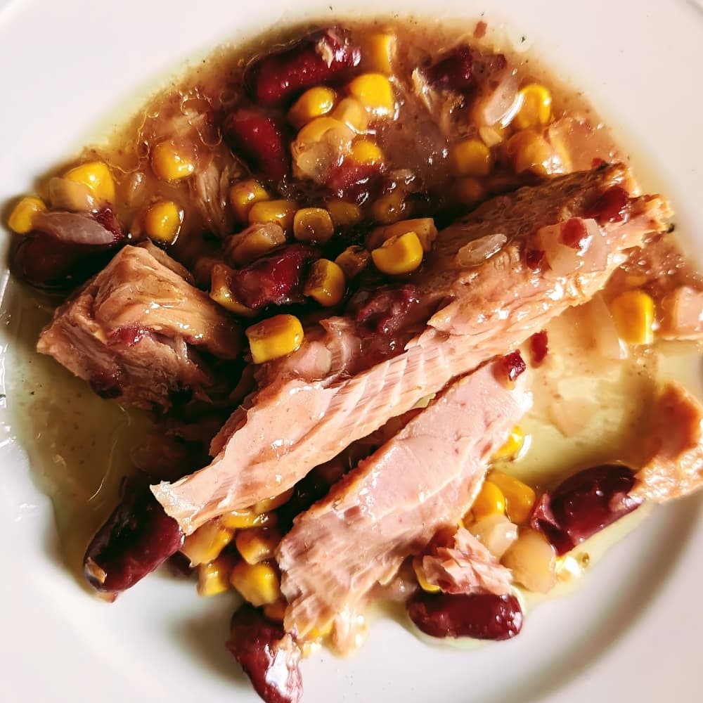 Dieses Gericht aus Thunfischfilets, Mais, roten Bohnen, Piri-Piri, Zitronensaft und Olivenöl ist ein ausgewogenes und nahrhaftes Hauptgericht oder Beilage.